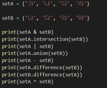 '가나다라'로 파이썬 set 집합을 만들었습니다.