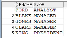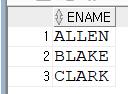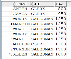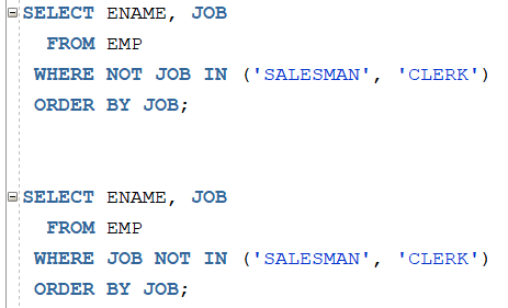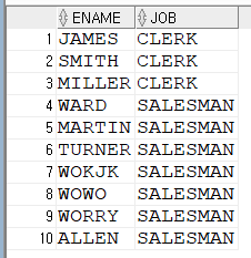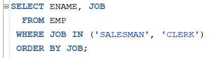 JOB이 ‘SALESMAN’ 과 ‘CLERK’를 조건으로 조회하고 싶은 경우 아래와 같이 작성합니다.