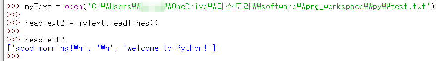 이번에는 readlines()를 사용해서 파일의 내용을 리스트로 받아봤습니다.