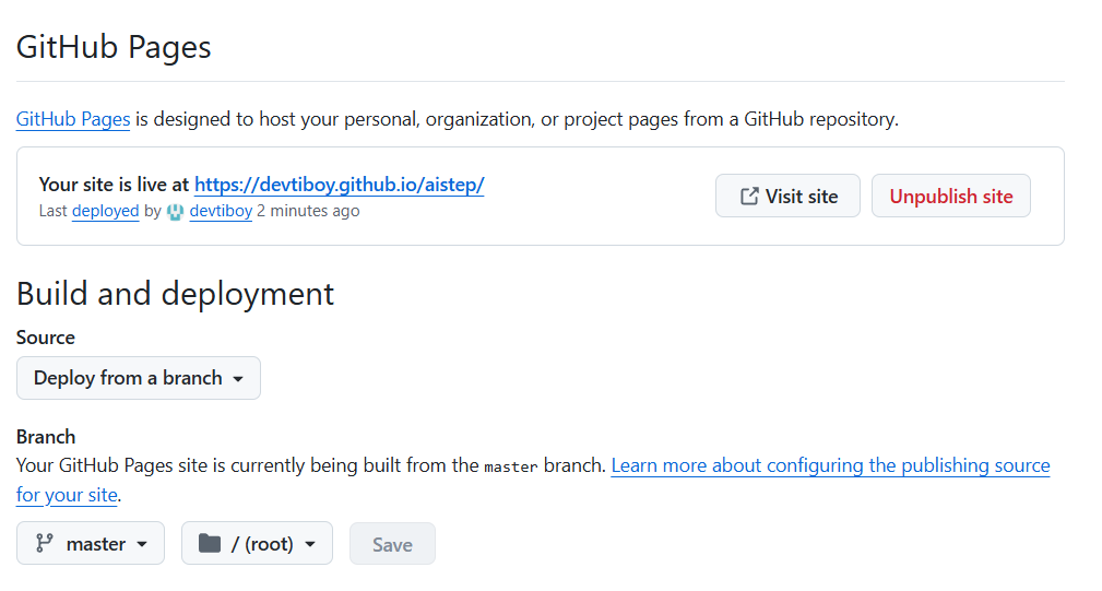"Your site is live at https://devtiboy.github.io/aistep/"이 보인다.