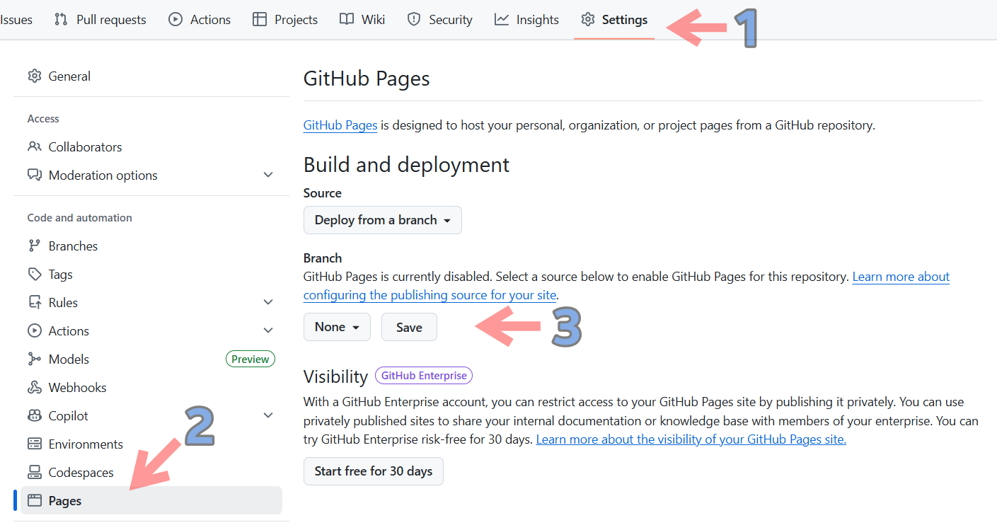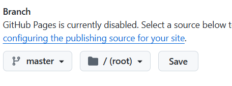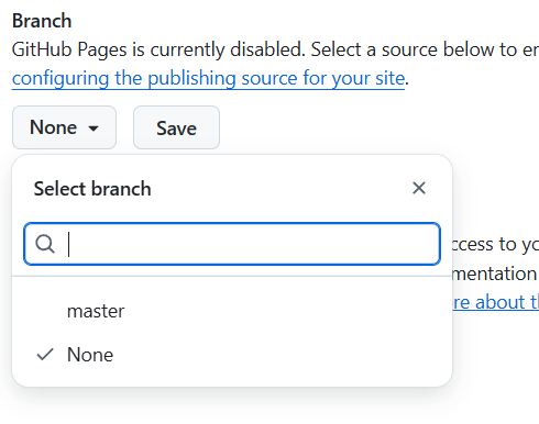 - GitHub Pages 페이지가 오른쪽에 나오고 Branch가 None로 되어 있다.