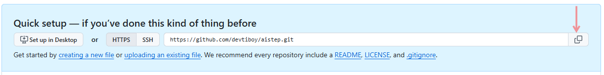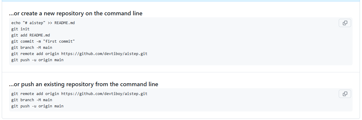 "aistep" 레파지토리(repository) 생성을 하면 위 화면이 나온다.