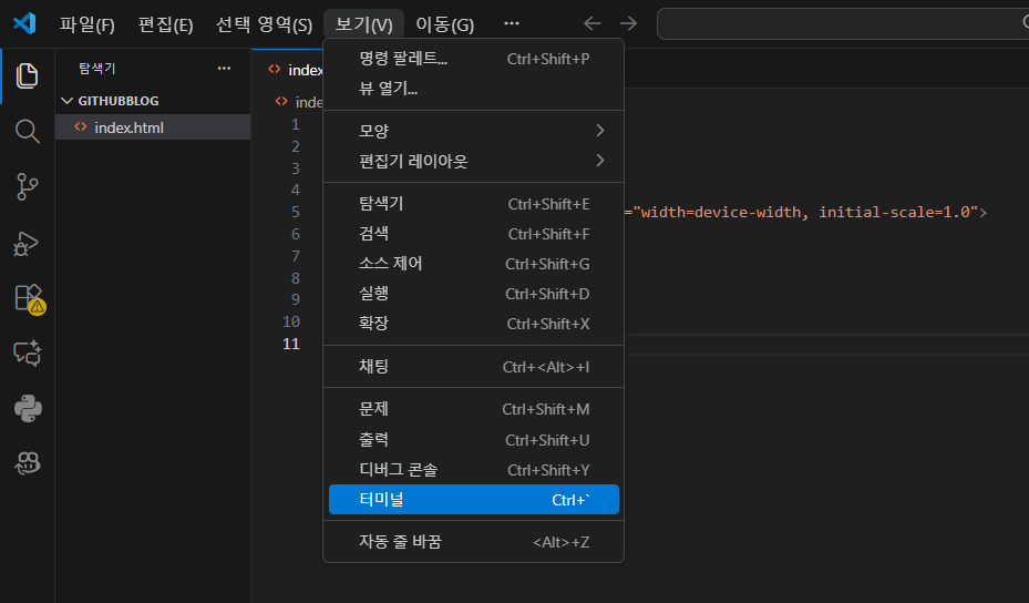 VSCode에서 상단 보기를 클릭하면 아래 터미널이 나온다. (단축키 : Ctrl + `)