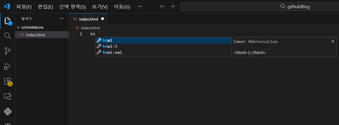 index.html 파일이 생성되고 우측에 코드창이 새로 만들어졌다.