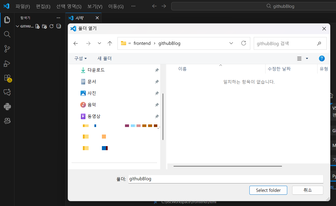 그리고 VSCode에서 만든 폴더까지 이동한 후 Select folder를 클릭했다.